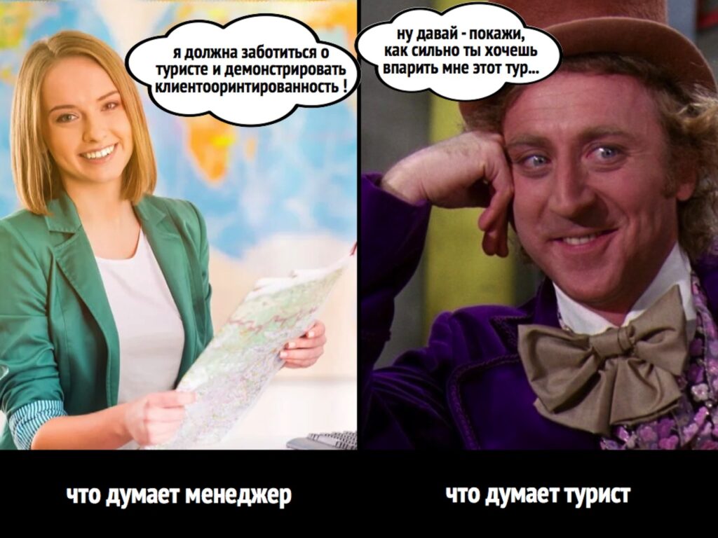 Даже если менеджер – wow-переговорщик, отлично знает турпродукт и виртуозно делает свою работу, само клеймо контекста «покупка-продажа тура» драматично снижает эффективность всего, что он туристу скажет.
