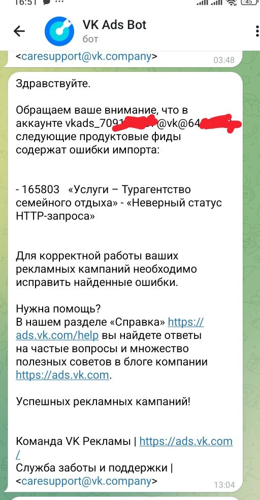 Это техническое уведомление, которое к вашим рекламным кампаниям скорее всего не имеет отношения. VK автоматически создал «каталог услуг» из вашей группы и теперь жалуется, что не может его обновить. Можете просто проигнорировать — на работу ваших объявлений это не влияет.