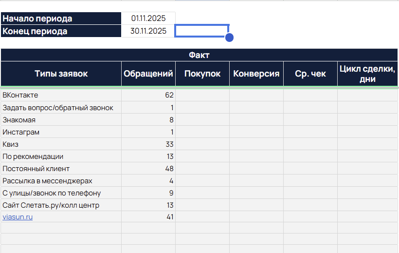 Новый KPI-ник (Автоматический): В нем мы считаем факт. Он нужен, чтобы в реальном времени видеть, попадаете вы в план или нет, и отслеживать честную конверсию и средний чек.