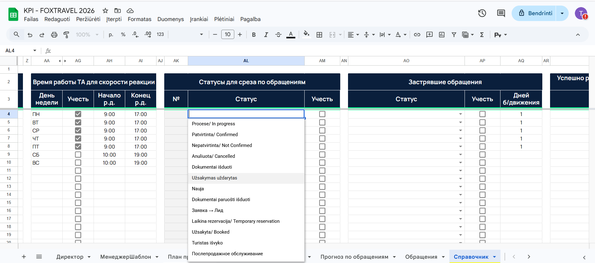 2. В Дашборде на листах менеджеров в разделе Срез по обращениям пусто, в разделе Обращения, которые нужно двигать - вообще какая-то дичь.