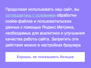 Коллеги , здравствуйте , кому присылал РКМ письма ( я так поняла автоматические ) по яндекс метрике на сайте , мы ничего не поняли с программистом - запутанее лексики я давно не встречала , но смысл ( если мы уяснили верно ) , что наш дисклеймер (вот эта плашка про куки ) у нас установлена так , будто мы собираем персональные данные через яндекс метрику ( но мы собираем только имя фамилия и все , что не является персональными данными ) , вот мы должны исправить дисклеймер или обосновать , что мы не собираем персональные данные. Кто с этим сталкивался