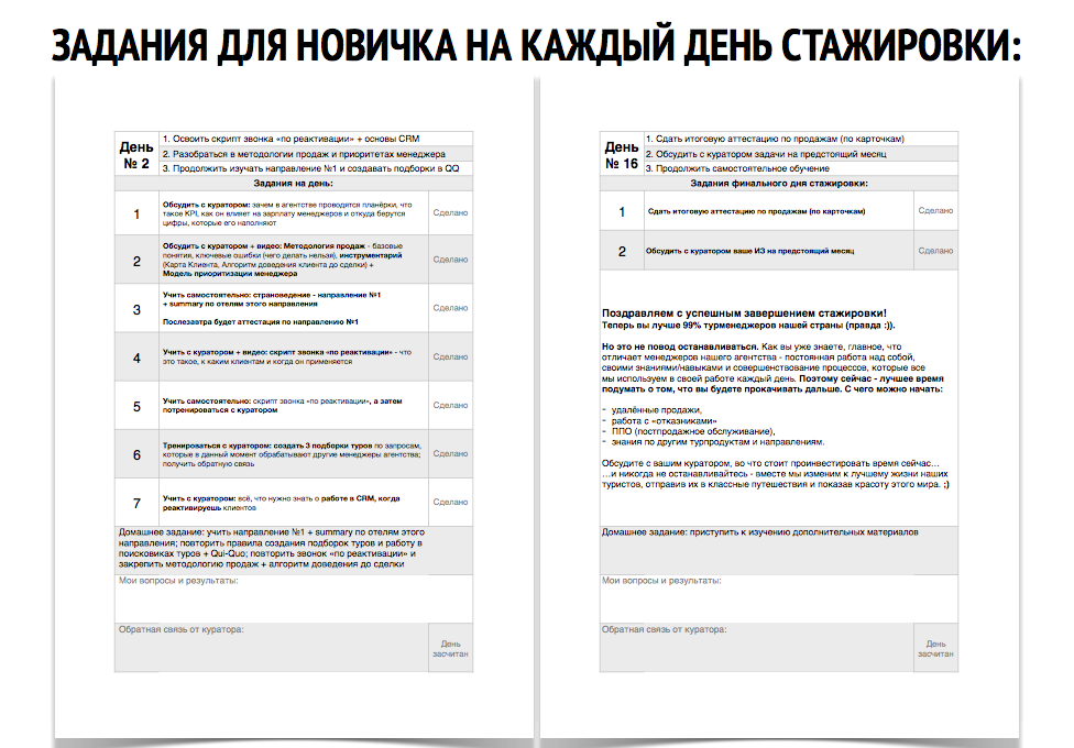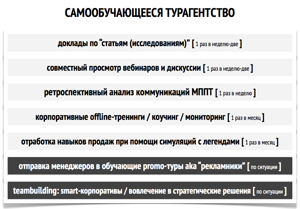 Посмотрев на перечень технологий и инструментов, из которых состоит программа, многие из вас могут удивиться и начать искать подвох: скрипты, бизнес-процессы, управленческие приёмы, автоматизированная стажировка, книги директора и менеджера, страноведение, раздатки для туристов, взращивание ЗАМов, финансовая и нефинансовая мотивация...