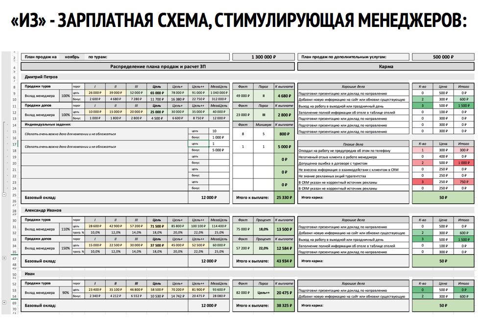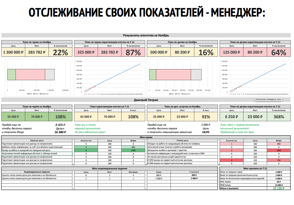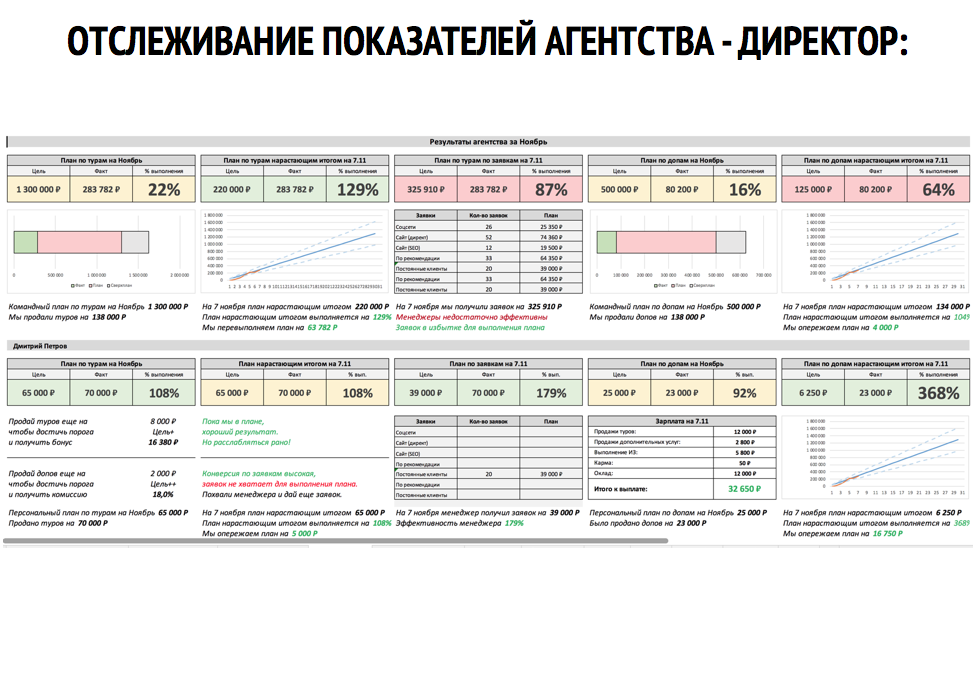 + готовые модели для учёта KPI турагентства и постановки плана продаж, увязанные с системами финансовой и нефинансовой мотивации, которые гарантируют, что менеджеры будут работать на максимум;